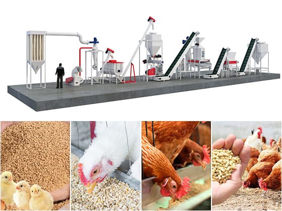 A complete chicken feed pellet production line from raw material processing to final finished pellets consists of a crushing system, mixing system, pelletizing system,cooling system, and packing system.